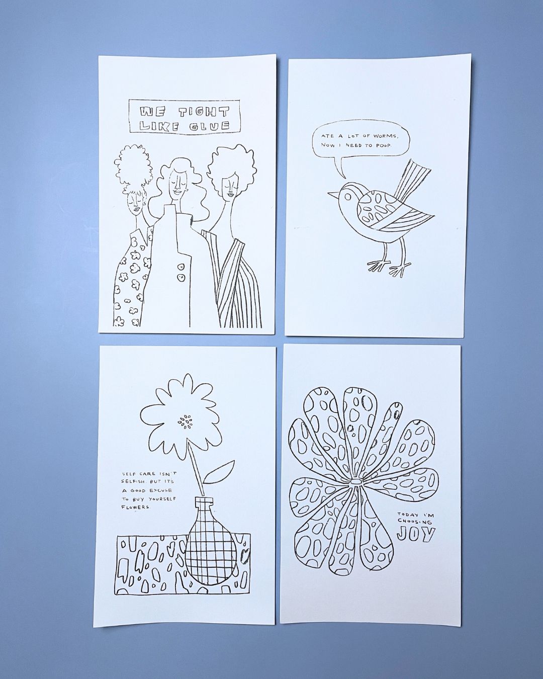 Inside, you’ll find a mix of stickers, cards, mini art prints, and sometimes, experiments that haven’t even hit the shop yet. It’s joyful. It’s unexpected. It’s low pressure.